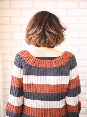 前髪重ためのオモ軽ボブ。毛先につけたワンカールの動きで、強くなり過ぎない柔らかいスタイルを。毛先に入れたグラデーションカラーで髪の動きとメリハリのあるスタイルに。